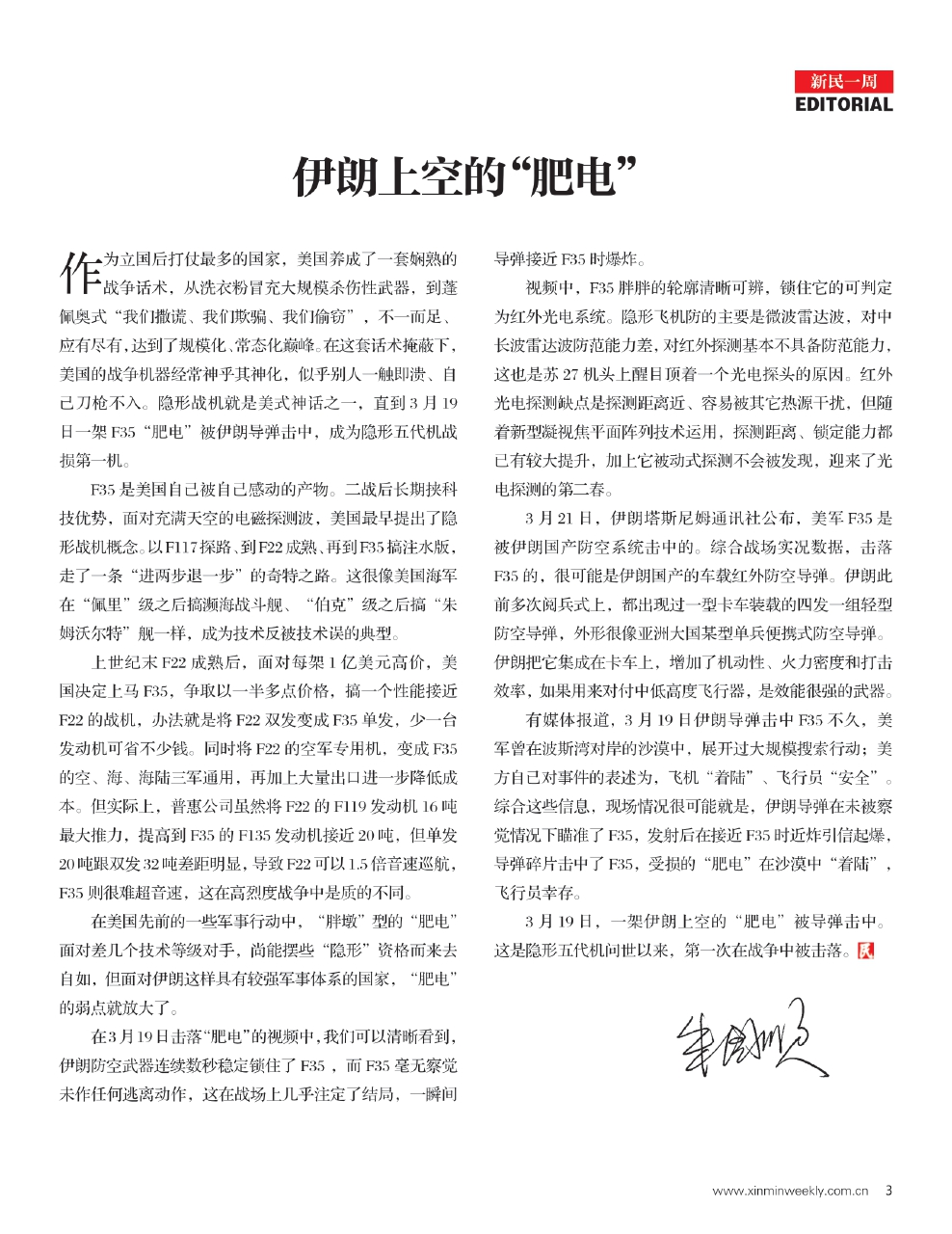 作为立国后打仗最多的国家,美国养成了一套娴熟的战争话术,从洗衣粉冒充大规模杀伤性武器,到蓬佩奥式“我们撒谎、我们欺骗、我们偷窃”,不一而足、应有尽有,达到了规模化、常态化巅峰。在这套话术掩蔽下,美国的战争机器经常神乎其神化,似乎别人一触即溃、自己刀枪不入。隐形战机就是美式神话之一,直到3月19日一架F35“肥电”被伊朗导弹击中,成为隐形五代机战损第一机。