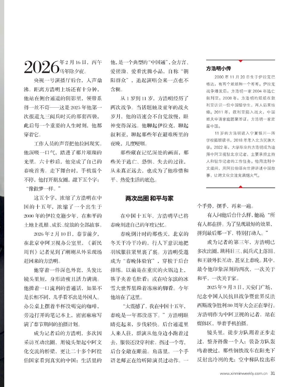 成为记者的第三年,方浩明已多次出圈,跳科目三、阅兵式上落泪、和王毅外长互动,甚至上春晚。其中,最令他印象深刻的两次,一次关于和平,一次关于家。