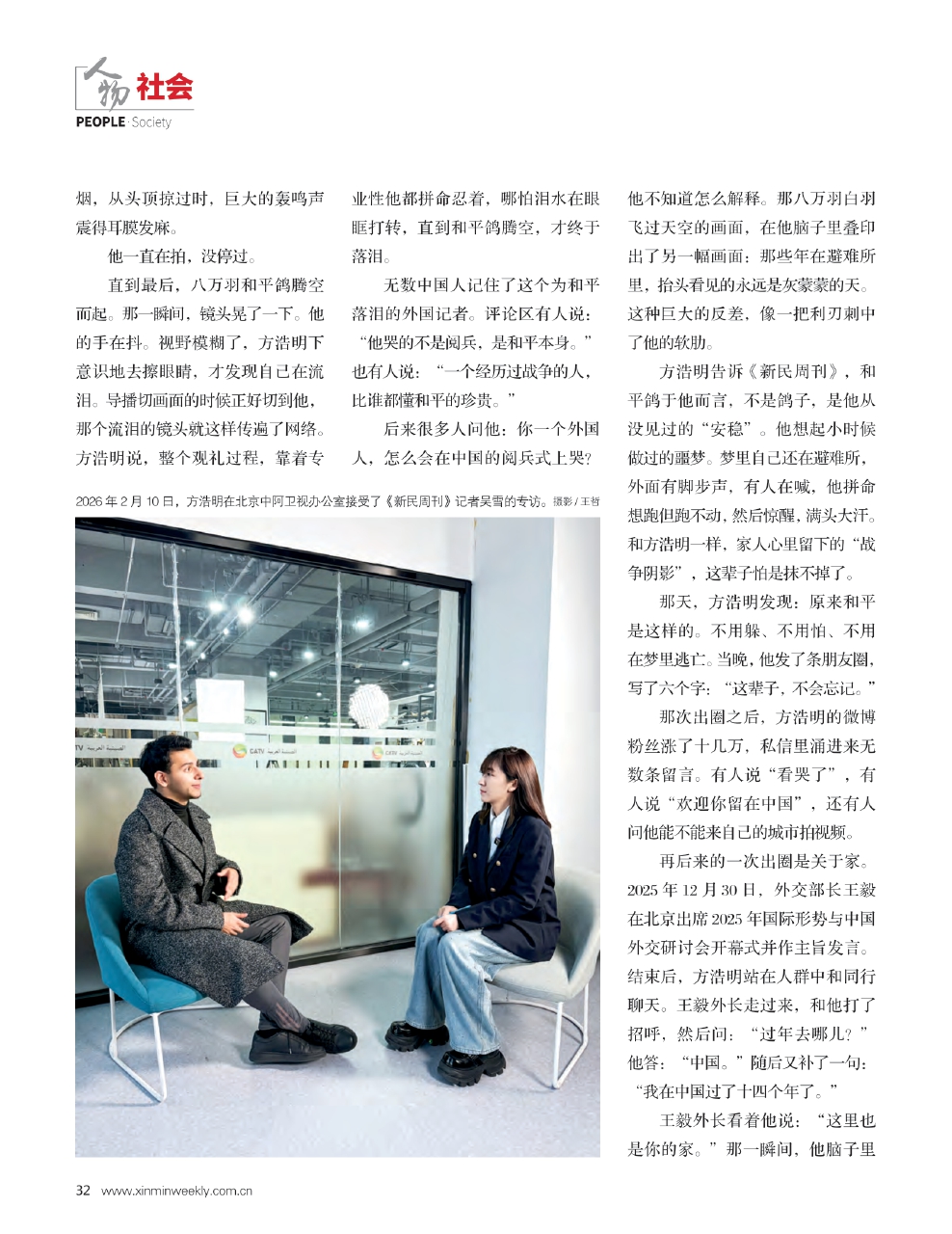 2026年2月10日,方浩明在北京中阿卫视办公室接受了《新民周刊》记者吴雪的专访。摄影/王哲