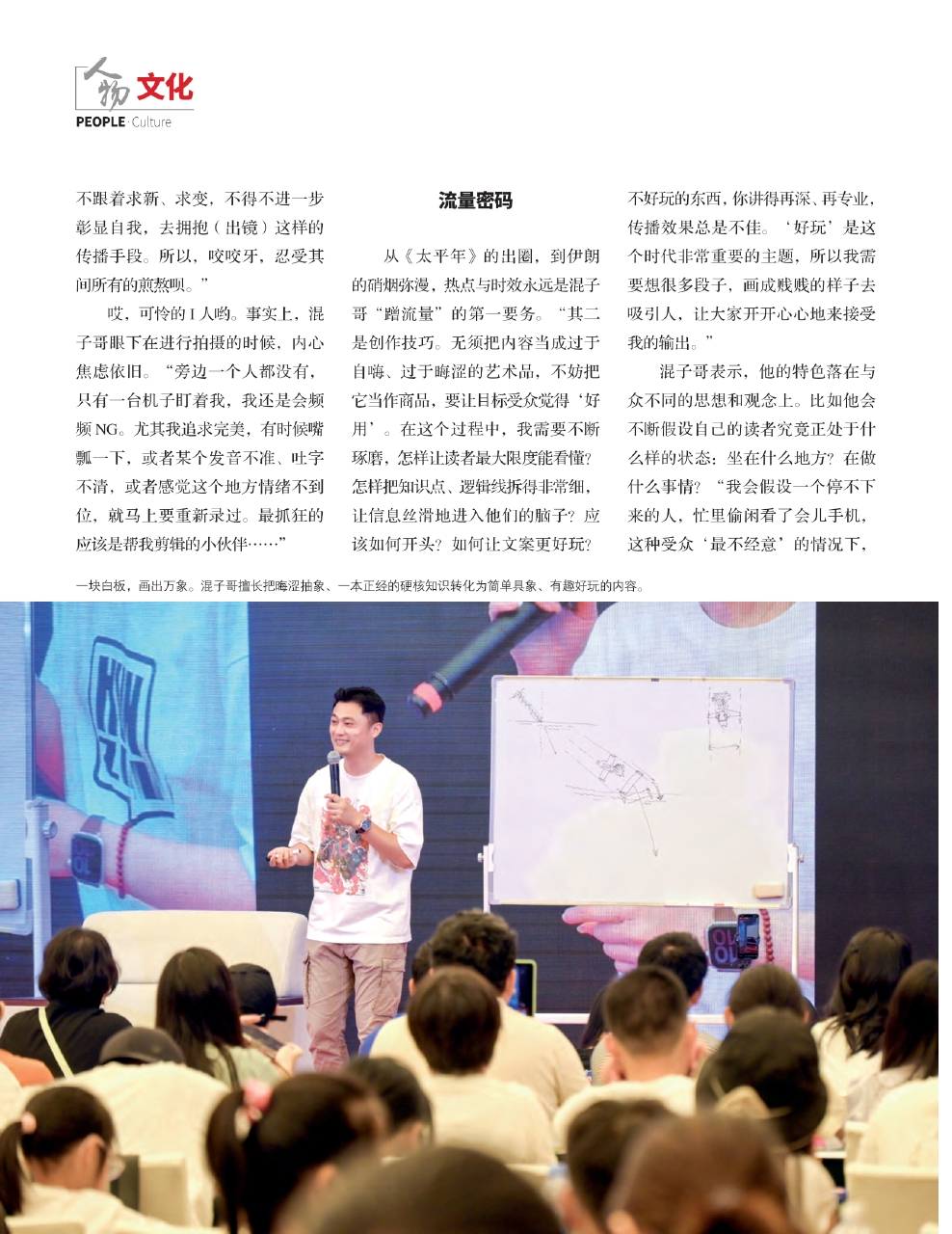 从图文时代进入短视频时代,自幕后走到镜头前的混子哥,其实经历了类似“渡劫”“涅槃”般的磨砺。“漫画家,或者绝大多数的幕后创作者,应该都是I人吧?我曾经就是个典型的I人,先缓缓沉淀,然后诉诸表达工具。我的舒适区绝对不是直面镜头,而是在一个无人关注的地方,比如一个僻静的小角落,慢悠悠地创作,谁也别来打搅我,我也不想跟谁说话,这才是我最惬意的状态。”