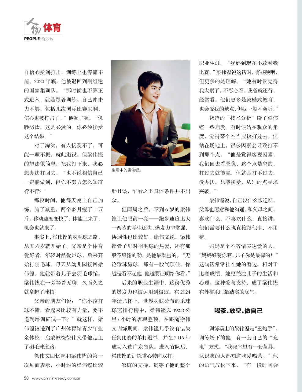 不在意别人的评价,不代表不审视自己。梁伟铿告诉《新民周刊》,直到2025年年底,自己才慢慢想明白一件事:究竟靠什么支撑自己走到今天,又是什么东西让他有了一定的成就。他提到一些老队员的引路与提携,其中一个人是已经退役的中国羽毛球运动员刘雨辰。“前辈也是想我们努力,就是不忘初心。这个很难,但如果你真能做到,结果肯定不会很差。”