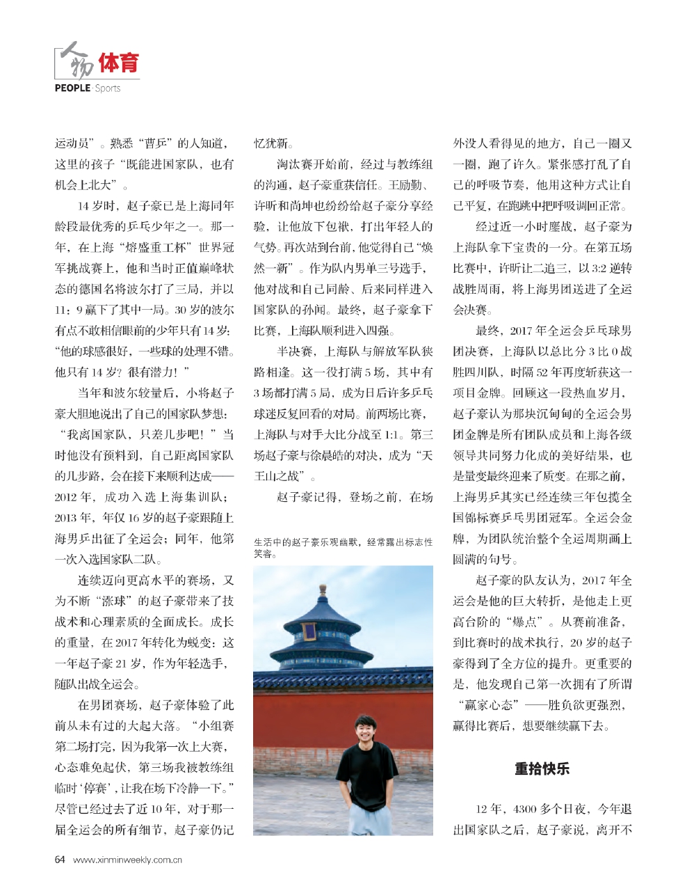 经历了更多样的世界后,赵子豪并未忘记来时路。接受《新民周刊》采访之前,他已经回到了上海队,恢复到日常训练中。谈到自己的身份,赵子豪露出标志性的笑容。他说:“我只是退出国家队,还没有退役。”