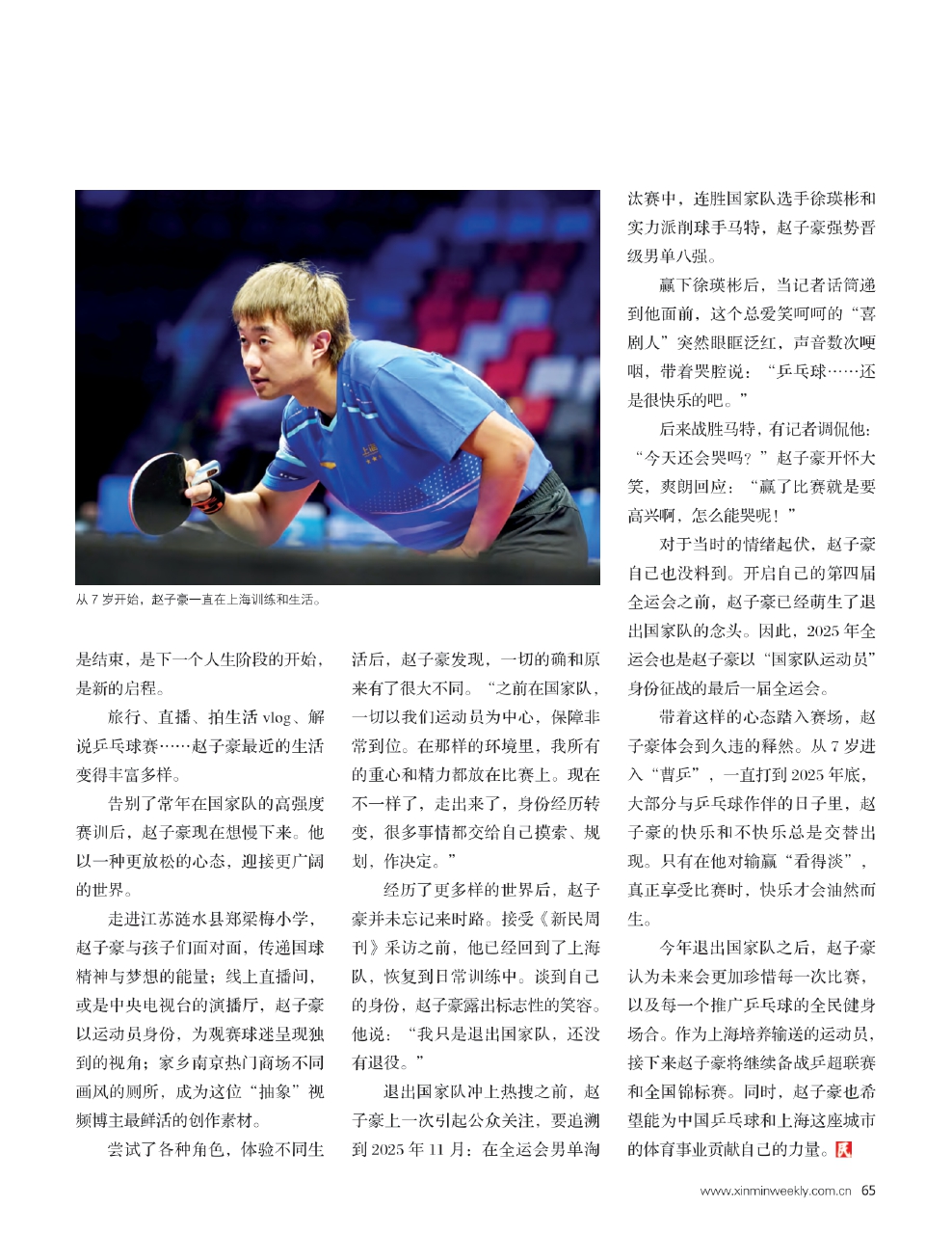 经历了更多样的世界后,赵子豪并未忘记来时路。接受《新民周刊》采访之前,他已经回到了上海队,恢复到日常训练中。谈到自己的身份,赵子豪露出标志性的笑容。他说:“我只是退出国家队,还没有退役。”