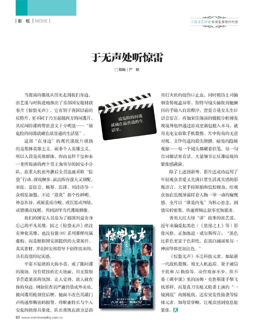 当诡谲的谍战从历史走到我们身边,张艺谋与时俱进地推出了首部国安题材故事片《惊蛰无声》,它有别于我国以前的反特片,更不同于乃至超越西方的间谍片,其反间防谍的警世意义十分明显——“最危险的间谍就藏在最普通的生活里”。