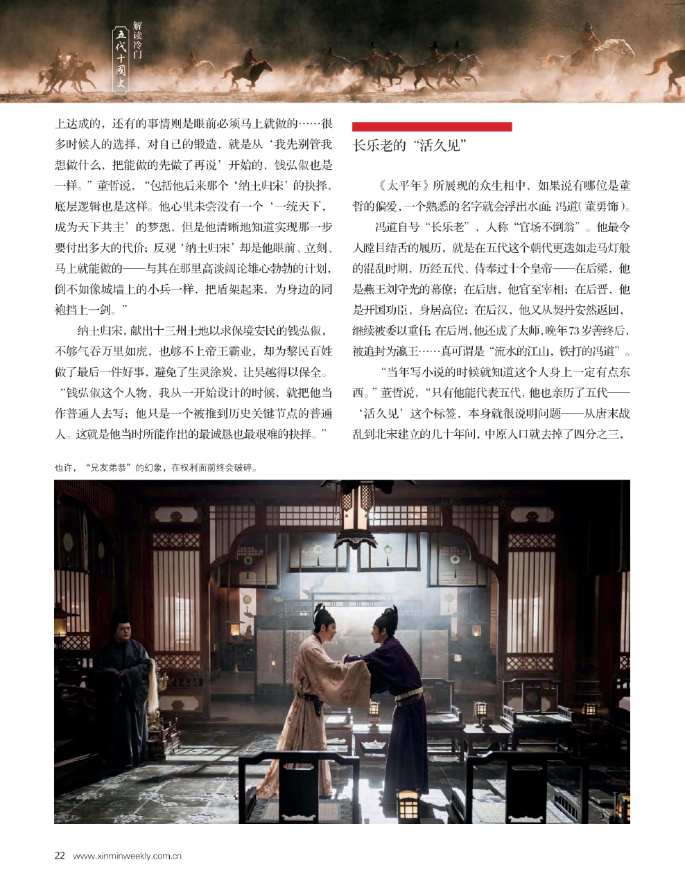 “当年写小说的时候就知道这个人身上一定有点东西。”董哲说,“只有他能代表五代,他也亲历了五代——‘活久见’这个标签,本身就很说明问题——从唐末战乱到北宋建立的几十年间,中原人口就去掉了四分之三,只有四分之一的人能够幸存,其中还包括新生儿呢。在这样‘十不存一’的时代,幸存本身就是很艰难的事;而冯道不仅生存下来、贯穿五代、代代为官,他甚至还修齐了儒家九经——这事在太平岁月都未必能做到。”