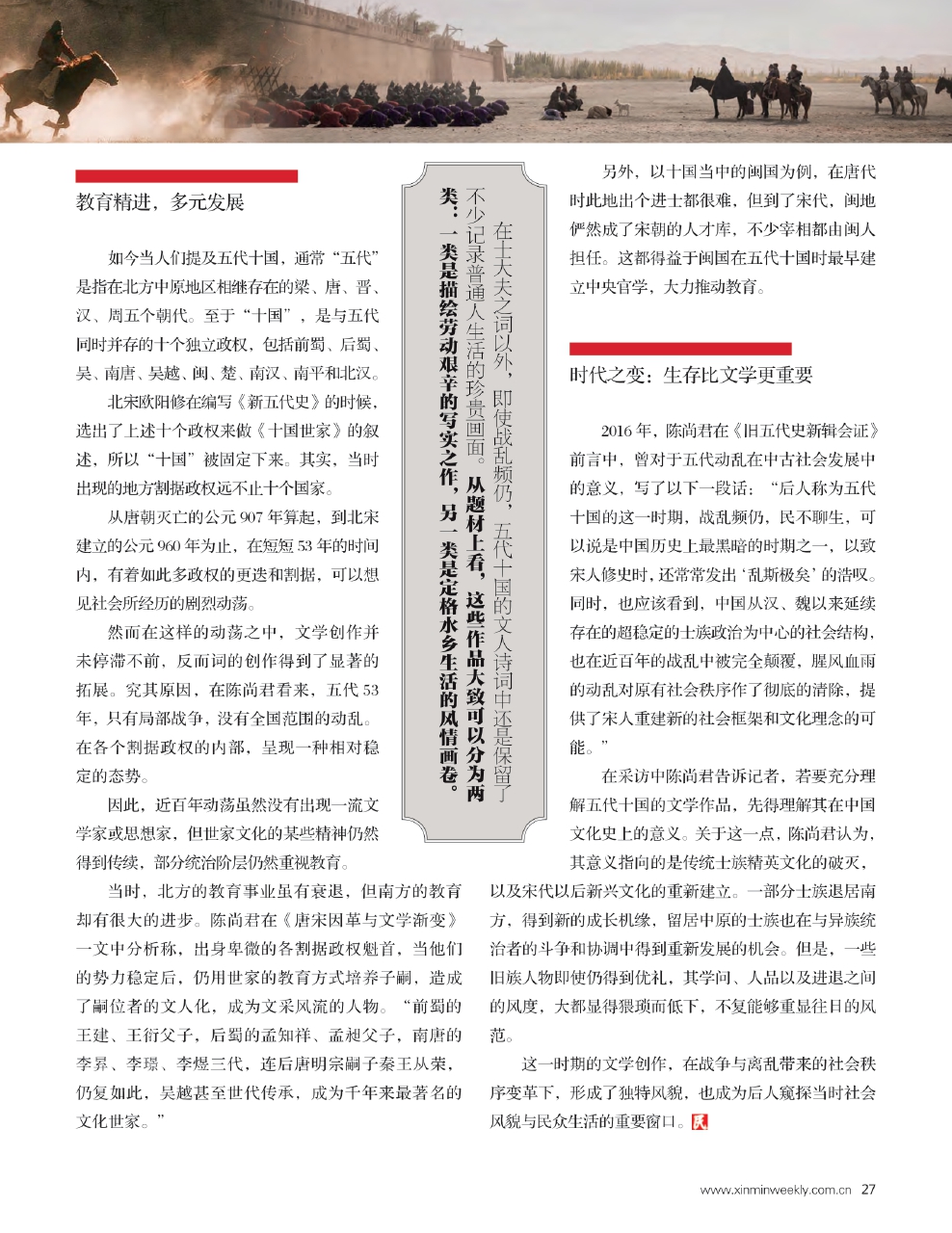 然而在这样的动荡之中,文学创作并未停滞不前,反而词的创作得到了显著的拓展。究其原因,在陈尚君看来,五代53年,只有局部战争,没有全国范围的动乱。在各个割据政权的内部,呈现一种相对稳定的态势。