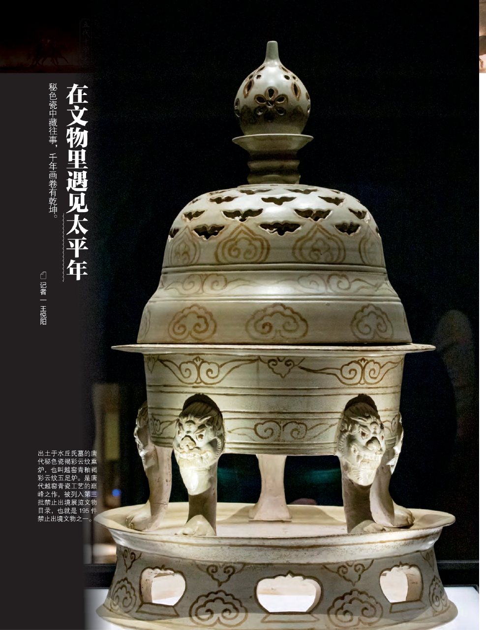 秘色瓷褐彩云纹熏炉通体施釉,釉色青翠而滋润,胎质细腻;器体硕大,高足足有66厘米,造型端庄,工艺精湛,历经千年依旧晶莹润泽。瓷面如凝露含烟,又如春水盈盈,兼具“水的光泽”和“玉的质感”,清雅而又高贵。蕴藏其中的,更是钱镠对母亲的一片孝心。