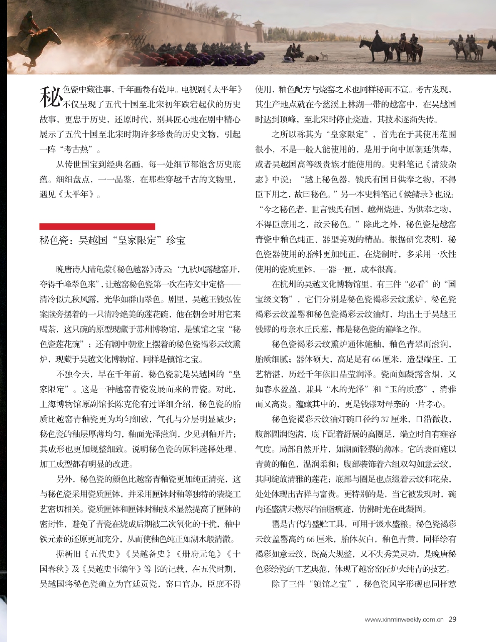 秘色瓷中藏往事,千年画卷有乾坤。电视剧《太平年》不仅呈现了五代十国至北宋初年跌宕起伏的历史故事,更忠于历史,还原时代,别具匠心地在剧中精心展示了五代十国至北宋时期许多珍贵的历史文物,引起一阵“考古热”。