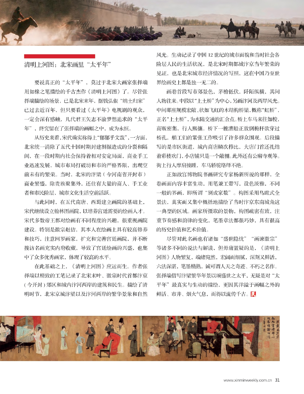 尽管对此名画也有诸如“盛世隐忧”“画谏徽宗”等诸多不同的说法与解读,但毋庸置疑的是,《清明上河图》人物繁复,端绪宛然,宏阔而细腻,深刻又鲜活,六法深湛,笔墨精熟,诚可谓人天之奇迹、不朽之名作。张择端借写汴梁繁华年景以颂盛世之太平,无疑是对“太平年”最真实与生动的描绘,更因其洋溢于画幅之外的鲜活、市井、烟火气息,而得以流传千古。