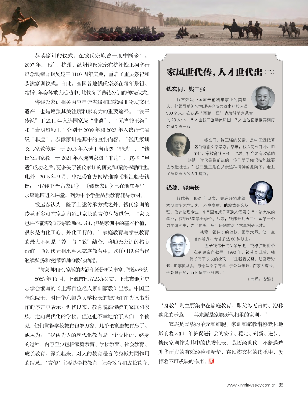 从古至今,钱氏一族,人才井喷,举世闻名。“我们不应该机械地认为这些名人就是因为接受了某一特定版本的家训才有所作为的,不要神化《钱氏家训》的作用。”钱运春向《新民周刊》记者表示,人们达成共识的一点是:千年以来钱氏家教文化的核心价值,经过言传身教,都在这些优秀人士身上体现出来。比如钱学森、钱三强、钱伟长“三钱”归国,就是“善事国家”精神的切实履行。