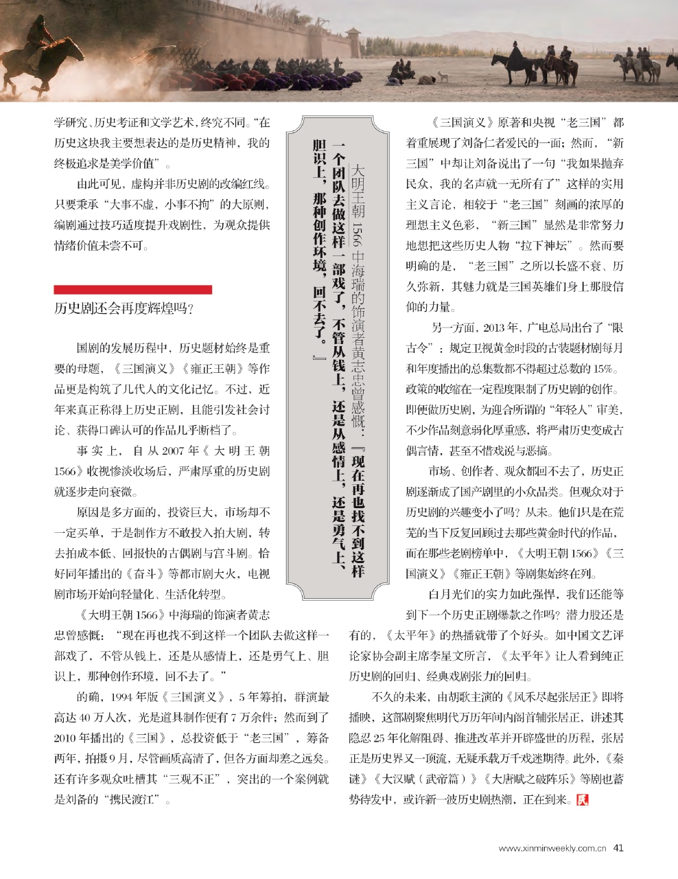 《大明王朝1566》中海瑞的饰演者黄志忠曾感慨:“现在再也找不到这样一个团队去做这样一部戏了,不管从钱上,还是从感情上,还是勇气上、胆识上,那种创作环境,回不去了。”
