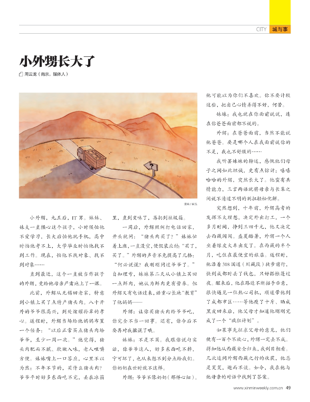 突然想到,十年前,外甥高考的发挥不太理想,决定外出打工,一个多月时间,挣到三四千元,他又决定去西藏闯闯。盛夏酷暑,外甥一个人坐着绿皮火车出发了。在西藏的半个月,吃住在最便宜的旅店。返程时,他沿着318国道(川藏段)徒步前行,快到成都时丢了钱包,只好搭帐篷过夜。醒来后,他在路边不断招手示意,很快遇见一位热心司机,顺道带他到了成都市区……等他瘦了十斤、晒成黑皮回来后,他父母才知道他刚刚完成了一个“疯狂计划”。