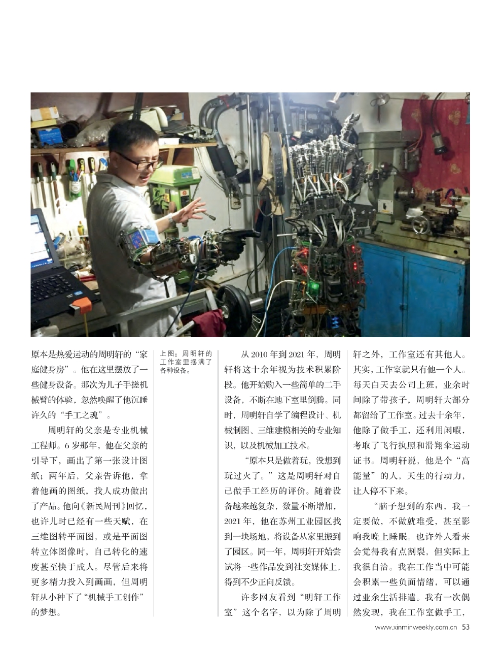 打造这个“手搓”出各种各样“怪”东西的工作室,最初只是周明轩为了满足儿子的一个愿望——2010年,漫威电影《钢铁侠》热映,在自家7平方米的地下室房间里,周明轩为儿子制作出一个高约2米的机械臂。