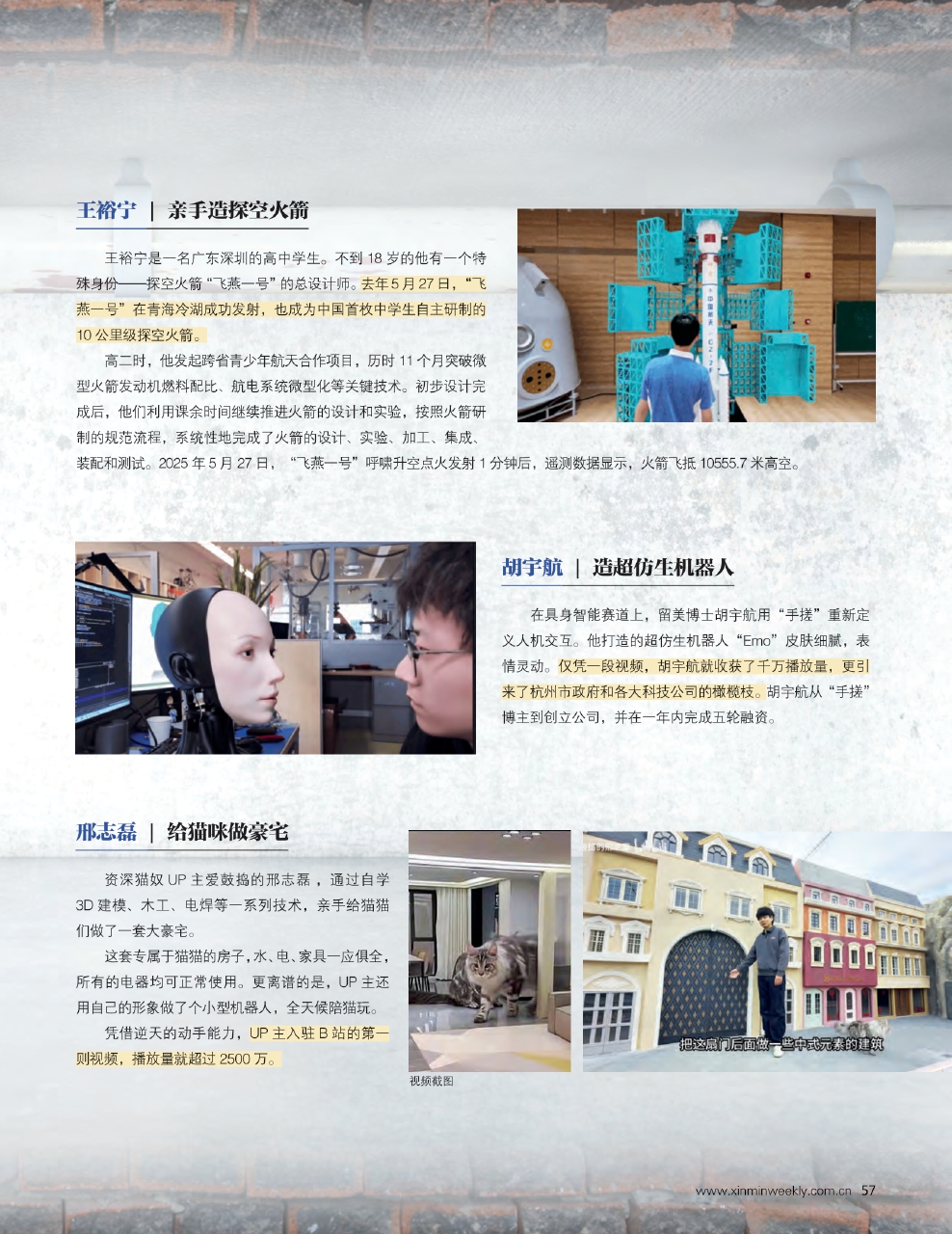 高二时,他发起跨省青少年航天合作项目,历时11个月突破微型火箭发动机燃料配比、航电系统微型化等关键技术。初步设计完成后,他们利用课余时间继续推进火箭的设计和实验,按照火箭研制的规范流程,系统性地完成了火箭的设计、实验、加工、集成、装配和测试。2025年5月27日,“飞燕一号”呼啸升空点火发射1分钟后,遥测数据显示,火箭飞抵10555.7米高空。