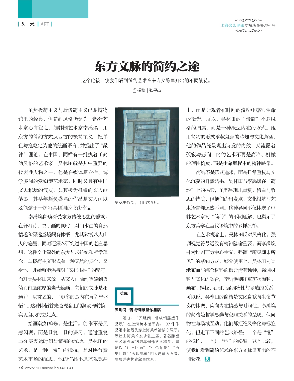 虽然极简主义与后极简主义已是博物馆里的经典,但简约风格仍然为一部分艺术家心向往之,如韩国艺术家李禹焕,用东方的简约方式反西方的极简主义,把单色与拖笔定为他的绘画语言,并提出了“敲钟”理论。在中国,同样有一批执着于简约风格的艺术家,吴林田就是其中重要的代表性人物之一。他是在媒体写专栏、博学多闻的觉知型艺术家,同时又具有中国文人雅玩的气质,如其极为推崇的文人画笔墨。其早年颇负盛名的作品是文人画以及能熔于一炉独具格调的书法作品。