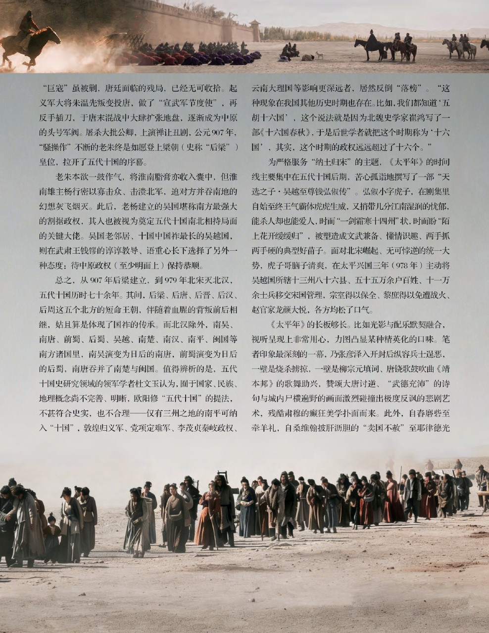 《太平年》的长板够长。比如光影与配乐默契融合,视听呈现上非常用心,力图凸显某种精英化的口味。笔者印象最深刻的一幕,乃张彦泽入开封后纵容兵士逞恶,一壁是烧杀掳掠,一壁是柳宗元填词、唐铙歌鼓吹曲《靖本邦》的歌舞助兴,赞颂大唐讨逆、“武德充沛”的诗句与城内尸横遍野的画面激烈碰撞出极度反讽的悲剧艺术,残酷肃穆的癫狂美学扑面而来。此外,自舂磨砦至牵羊礼,自桑维翰披肝沥胆的“卖国不赦”至耶律德光愤懑破防的“胡汉有别”,还有王朴讲革命、冯道说封建、司马浦斥原罪、沈寅论治乱分合等高光“整活”桥段,沉淀了主创的思考,皆在剧外引发热议。
