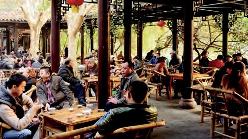 鹤鸣茶社位于人民公园内,创立于1923年,是成都现存最老、最大的露天茶馆。一把竹椅、一张矮桌、一碗盖碗茶,是成都人春天的标配。