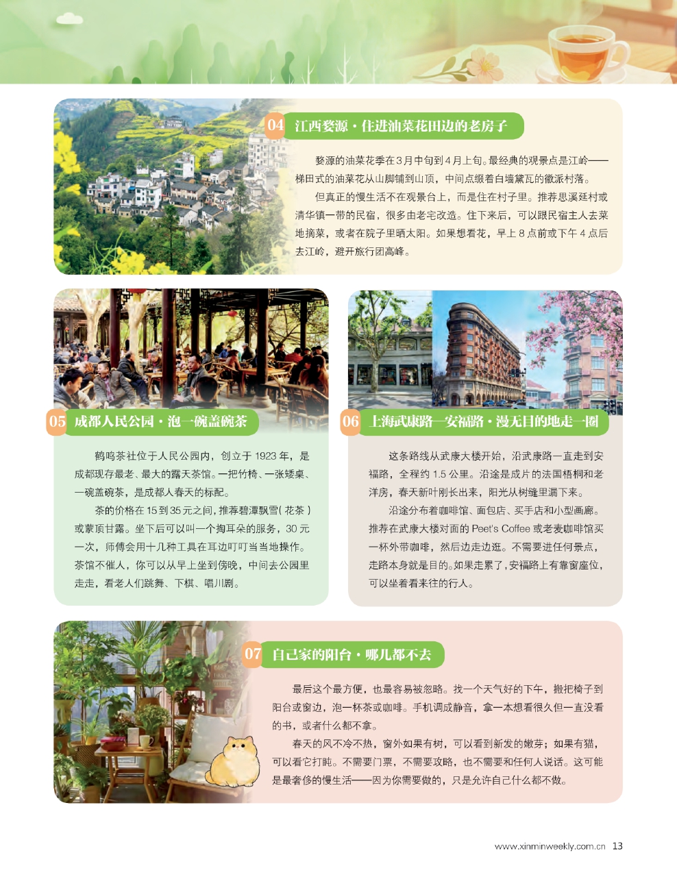 春天适合放慢脚步。找一个地方坐下来,喝杯茶、发发呆,让时间自己流逝。