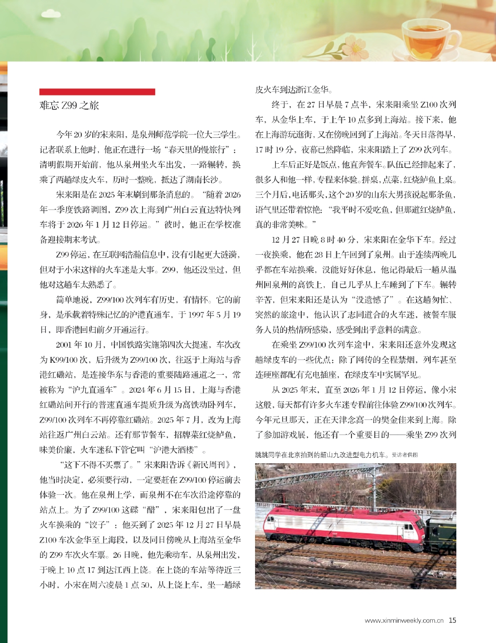 从2025年末,直至2026年1月12日停运,像小宋这般,每天都有许多火车迷专程前往体验Z99/100次列车。今年元旦那天,正在天津念高一的樊金佳来到上海。除了参加游戏展,他还有一个重要目的——乘坐Z99次列车。