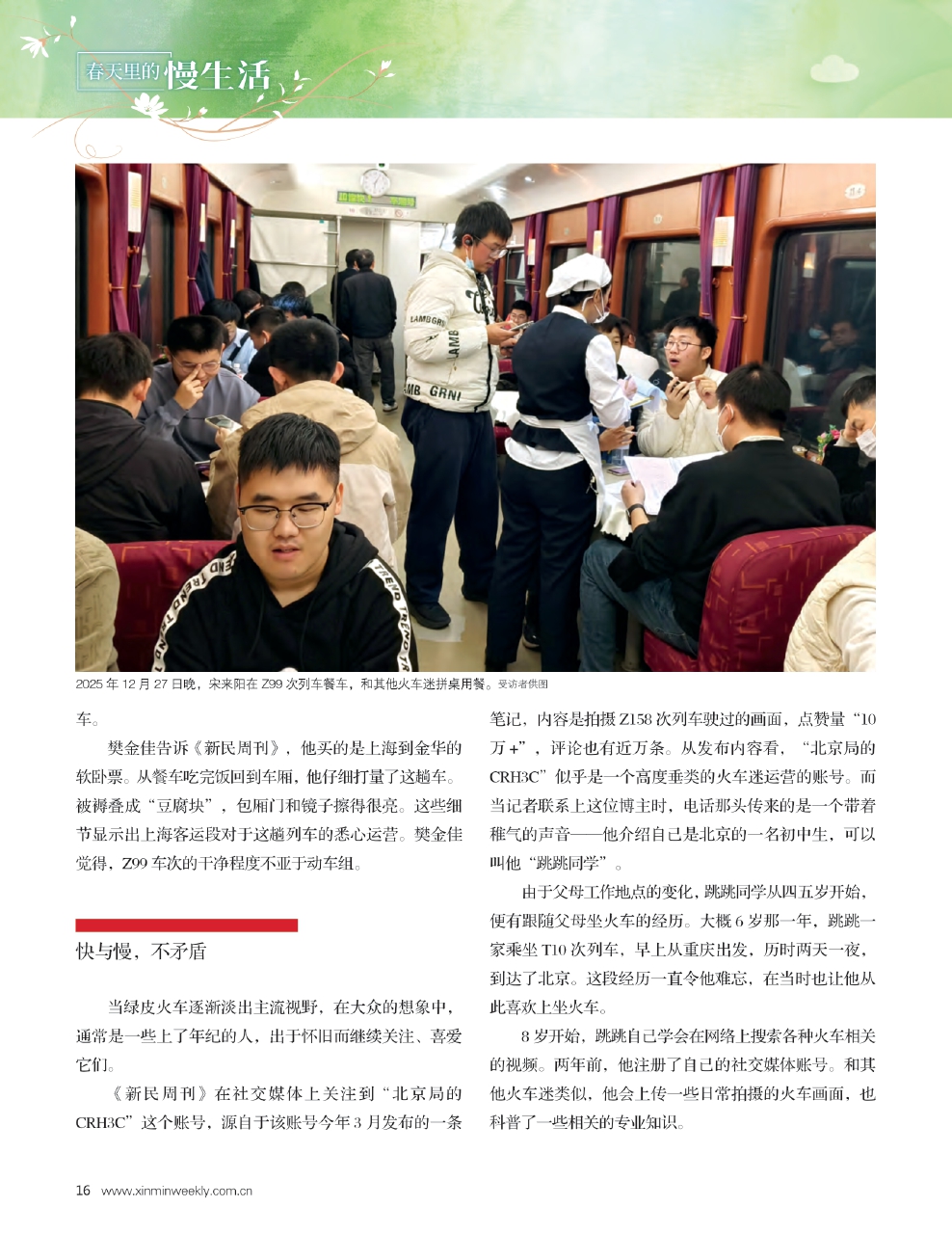 从2025年末,直至2026年1月12日停运,像小宋这般,每天都有许多火车迷专程前往体验Z99/100次列车。今年元旦那天,正在天津念高一的樊金佳来到上海。除了参加游戏展,他还有一个重要目的——乘坐Z99次列车。