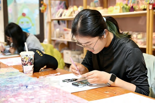 在上海最热闹的淮海路上,鳞次栉比的商场里都或多或少藏着DIY手工坊,传统的陶艺、蛋糕烘焙依旧人气不减,琉璃饰品、手绘布袋、香薰蜡烛、拼豆、奶油胶、流体熊等新兴项目更是遍地开花,形成“百花齐放”的繁荣景象。这些项目价格亲民,大多在几十到几百元之间,却需要投入数小时甚至数天的专注时间,恰好契合了年轻人“花钱买时间、付费换体验”的消费心理,成为年轻人消费新宠。即便不是周末,手作店里的生意依然不错,年轻人三五成群,带着朋友、恋人、闺蜜,甚至爸妈孩子一起,挑好材料包就围坐下来,在店员简单指点下,把一堆零散的小珠子、彩纸条慢慢变成独一无二的小作品。