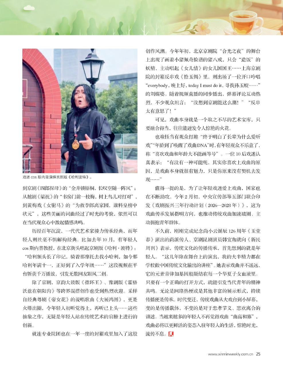 历经百年沉淀,一代代艺术家接力传承经典,而年轻人则丝毫不惧解构经典。比如去年10月,有年轻人cos斯内普教授,在北京街头唱起京剧版《哈利·波特》:“哈利额头长了印记,骑着那摩托去找小哈利,如今那哈利年满十一,正好到了入学年级……”这段视频在平台斩获千万播放,引发无数网友跟风二创。