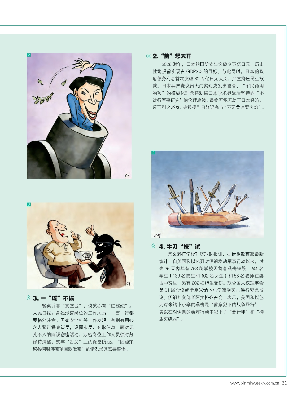 2.“苗”想天开 2026财年,日本的国防支出突破9万亿日元,历史性地提前实现占GDP2%的目标。与此同时,日本的政府债务利息首次突破30万亿日元大关,严重挤压民生拨款。日本共产党议员大门实纪史发出警告,“军民两用物项”的模糊化理念将动摇日本学术界战后坚持的“不进行军事研究”的伦理底线,最终可能无助于日本经济,反而引火烧身。央视援引日媒评高市“不要黄油要大炮”。