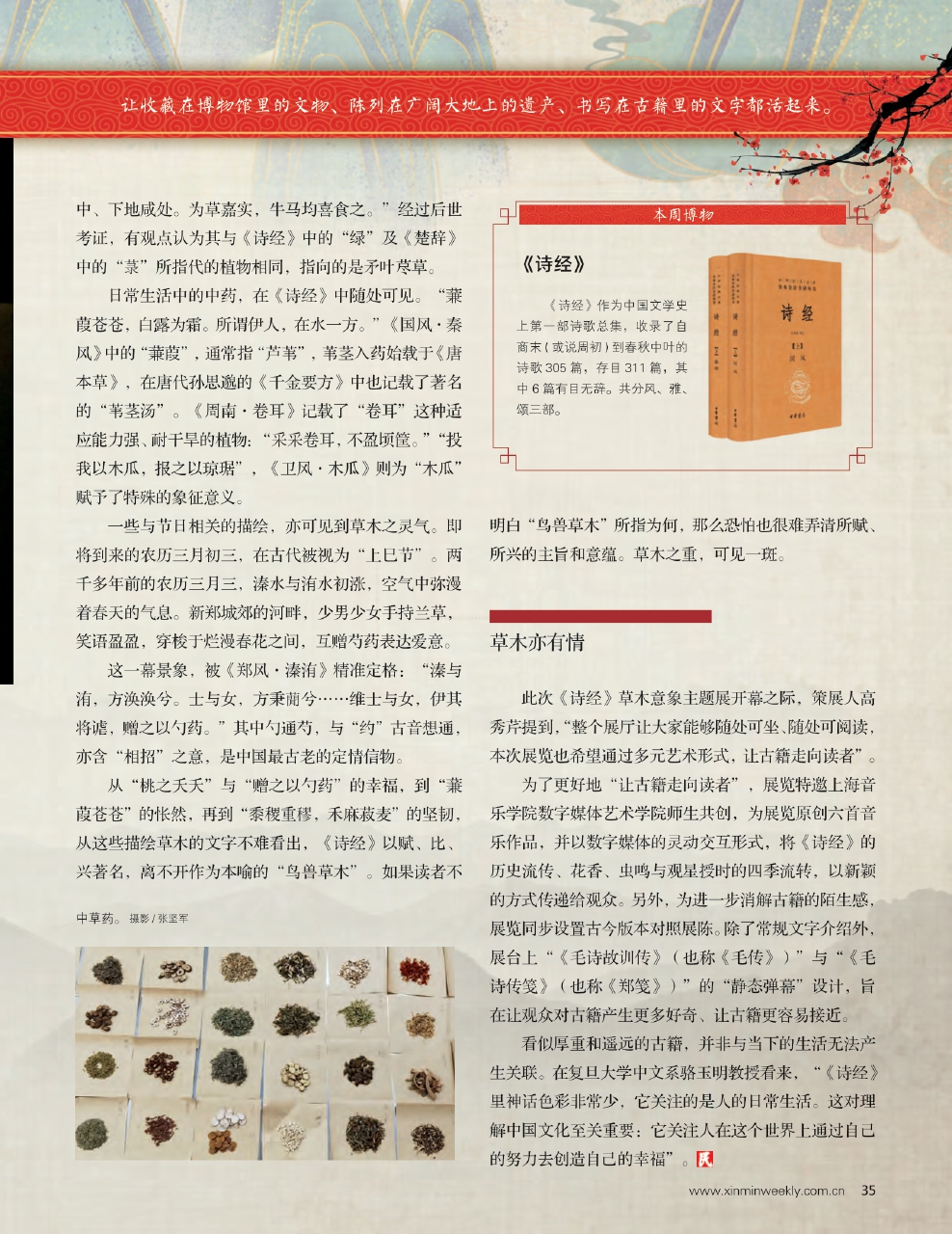 此次展览,策展团队选取《诗经》中的28篇诗作,以其中提及的46种草木作为切入口,邀请读者一起踏入《诗经》的百草园。一草一木,明亮的颜色与芳香的气味,千万年来提醒世人寒冬渐远,而春天已至。
