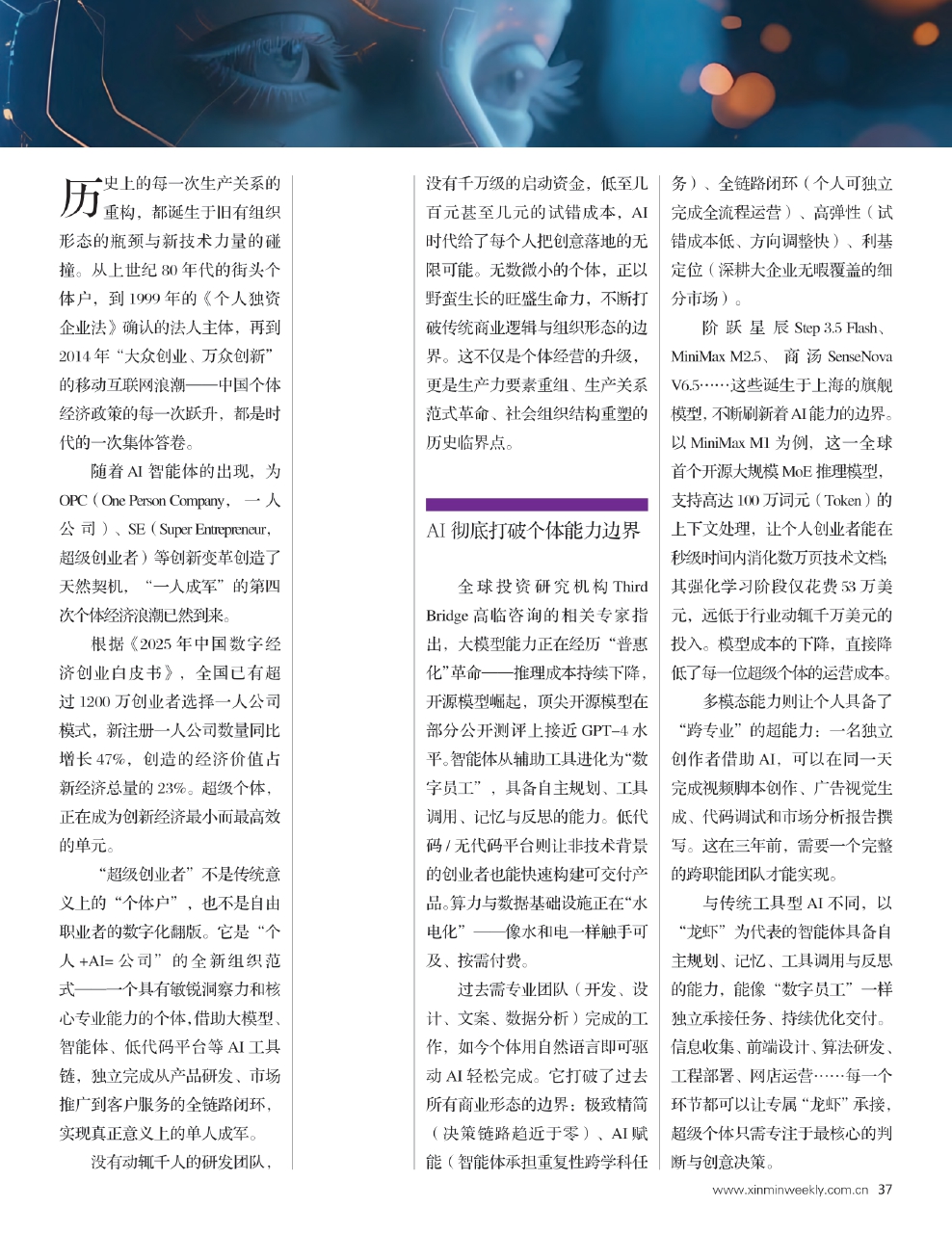 没有动辄千人的研发团队,没有千万级的启动资金,低至几百元甚至几元的试错成本,AI时代给了每个人把创意落地的无限可能。无数微小的个体,正以野蛮生长的旺盛生命力,不断打破传统商业逻辑与组织形态的边界。这不仅是个体经营的升级,更是生产力要素重组、生产关系范式革命、社会组织结构重塑的历史临界点。