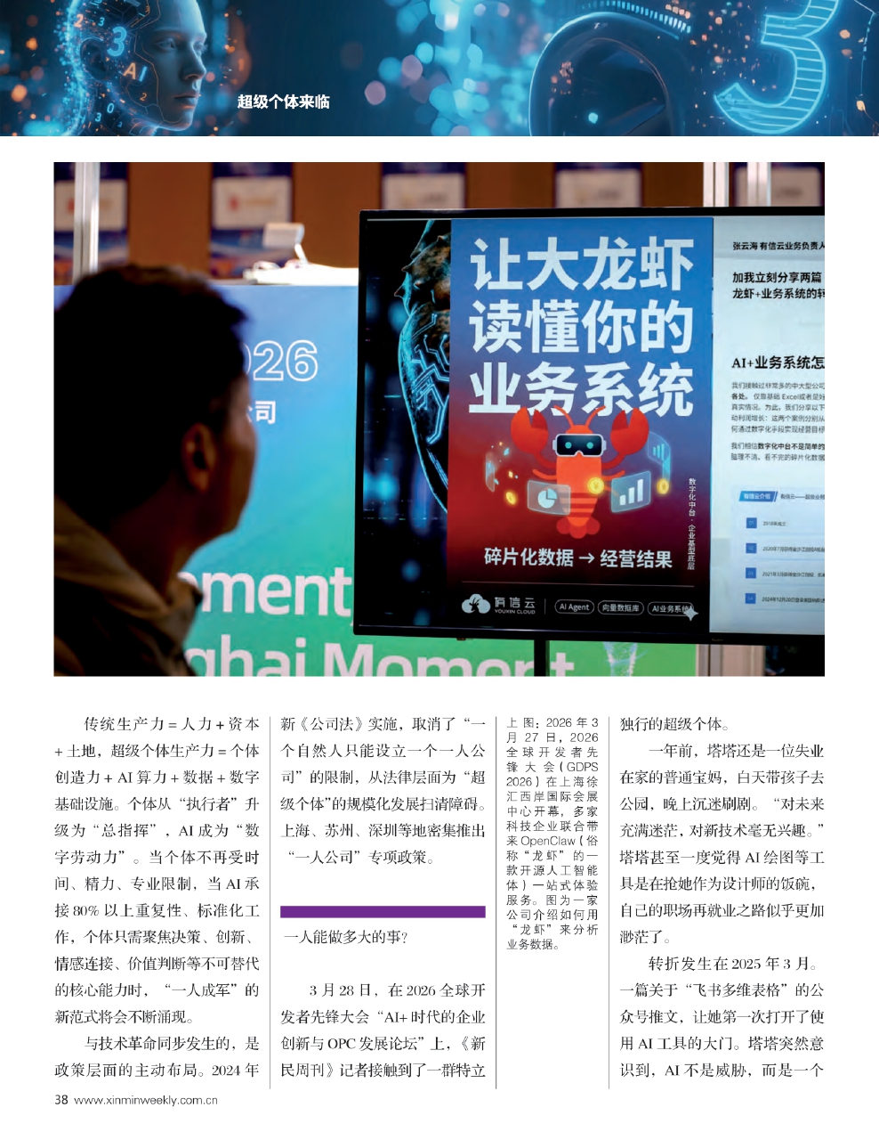 3月28日,在2026全球开发者先锋大会“AI+时代的企业创新与OPC发展论坛”上,《新民周刊》记者接触到了一群特立独行的超级个体。