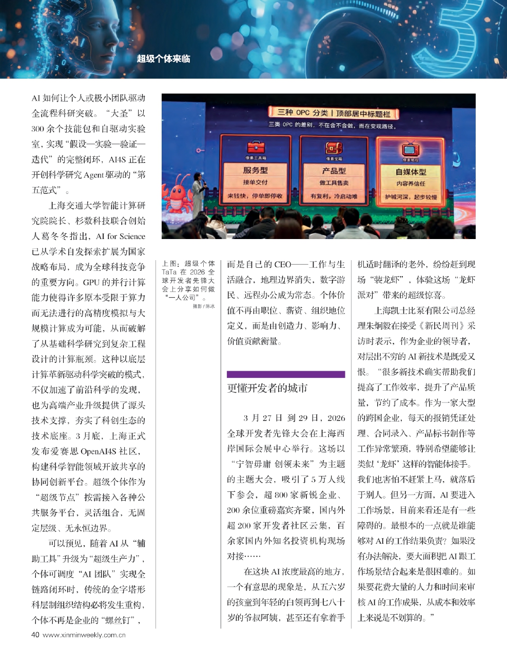 3月28日,在2026全球开发者先锋大会“AI+时代的企业创新与OPC发展论坛”上,《新民周刊》记者接触到了一群特立独行的超级个体。