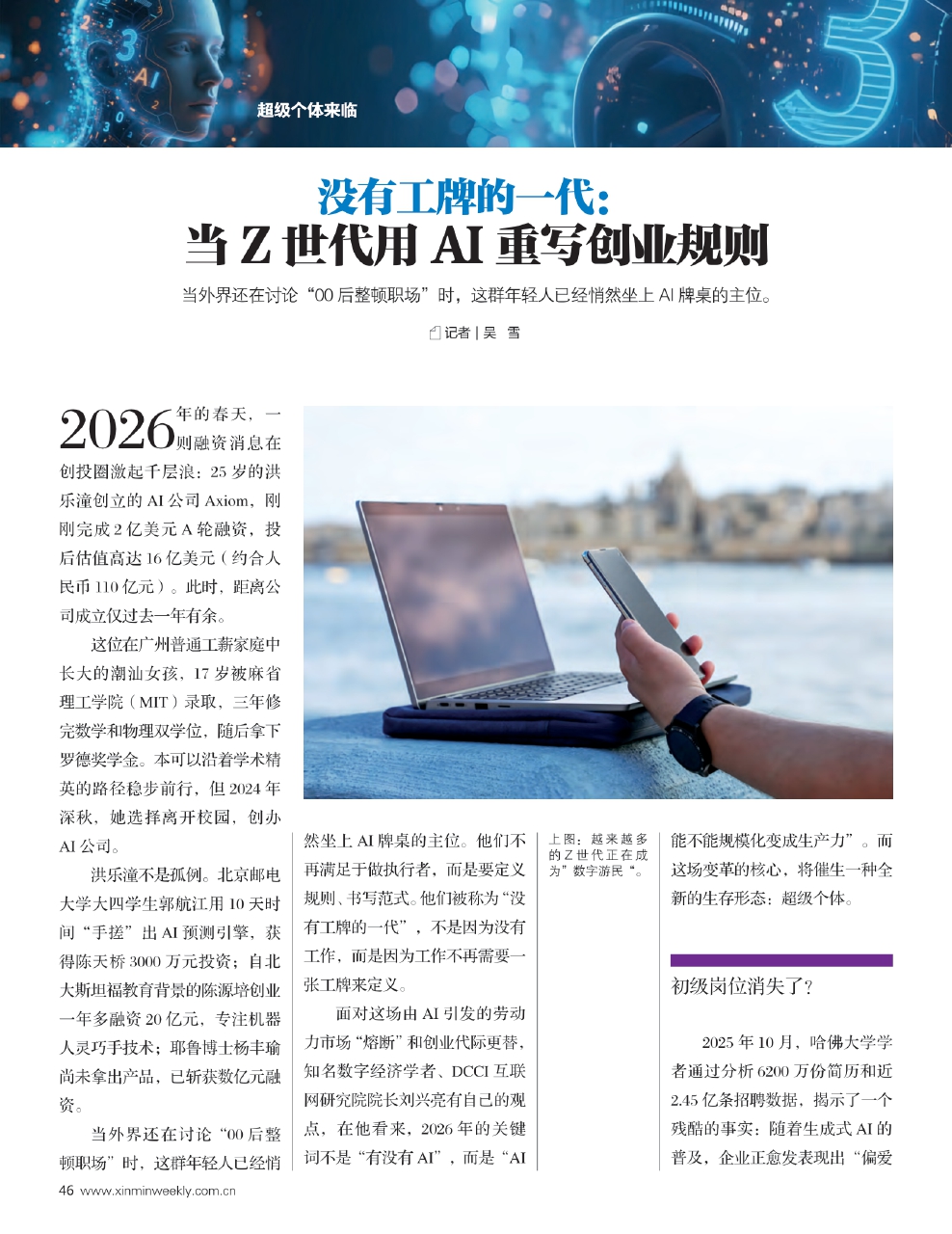 据《2026胡润U40全球白手起家富豪榜》显示,AI行业已诞生27位十亿美元级企业家,平均年龄仅32岁。不少投资人直言:如果AI创业团队里没有00后核心成员,可能都不会投。