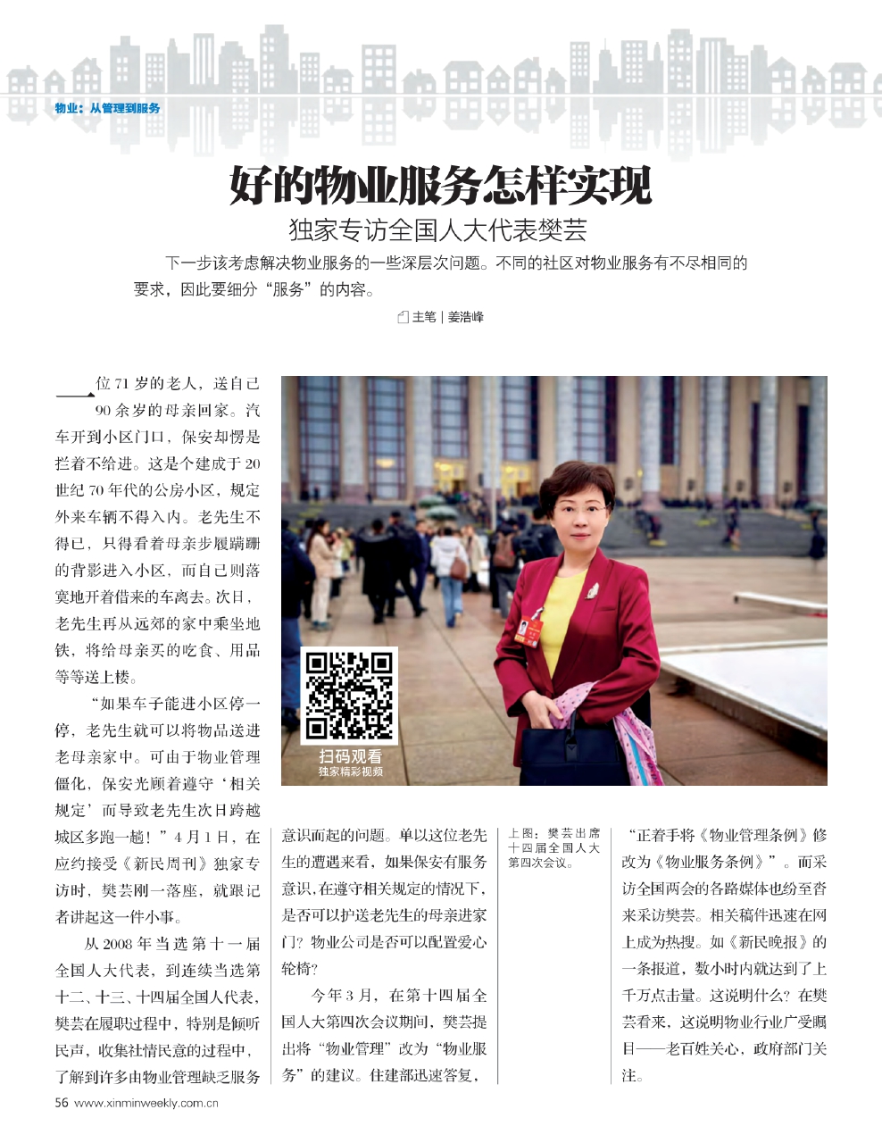 从2008年当选第十一届全国人大代表,到连续当选第十二、十三、十四届全国人代表,樊芸在履职过程中,特别是倾听民声,收集社情民意的过程中,了解到许多由物业管理缺乏服务意识而起的问题。单以这位老先生的遭遇来看,如果保安有服务意识,在遵守相关规定的情况下,是否可以护送老先生的母亲进家门?物业公司是否可以配置爱心轮椅?