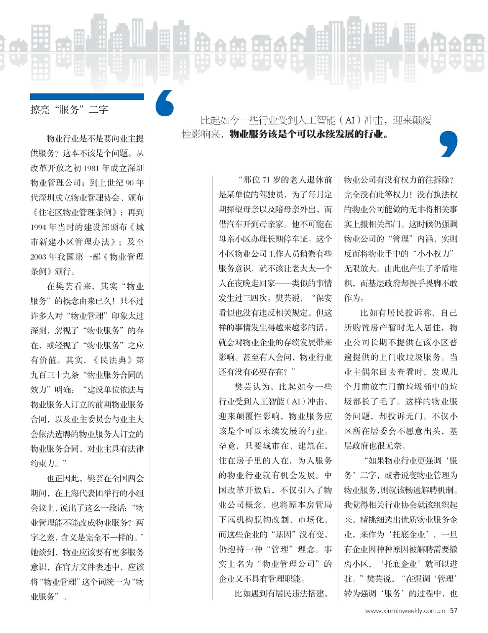 今年3月,在第十四届全国人大第四次会议期间,樊芸提出将“物业管理”改为“物业服务”的建议。住建部迅速答复,“正着手将《物业管理条例》修改为《物业服务条例》”。而采访全国两会的各路媒体也纷至沓来采访樊芸。相关稿件迅速在网上成为热搜。如《新民晚报》的一条报道,数小时内就达到了上千万点击量。这说明什么?在樊芸看来,这说明物业行业广受瞩目——老百姓关心,政府部门关注。