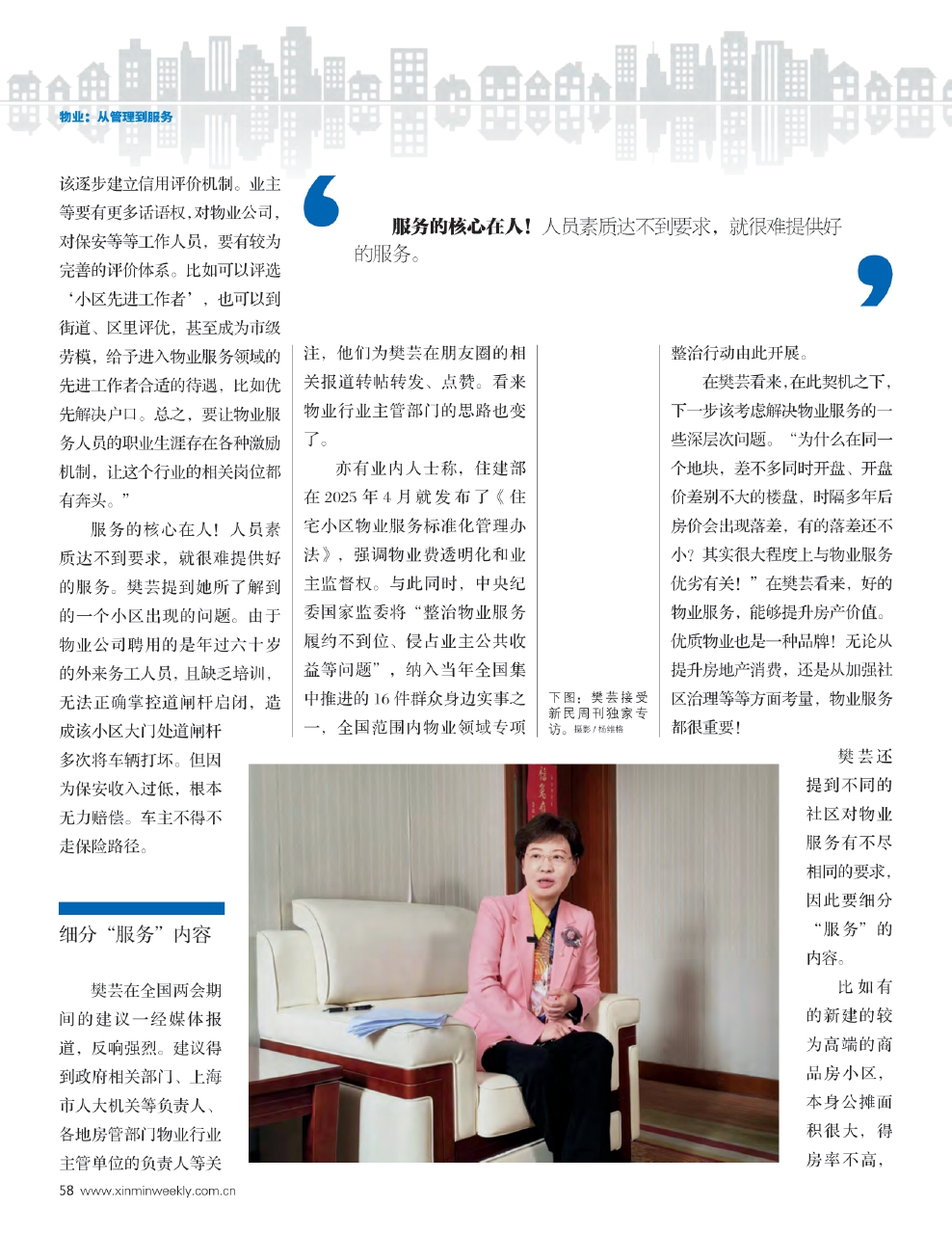 今年3月,在第十四届全国人大第四次会议期间,樊芸提出将“物业管理”改为“物业服务”的建议。住建部迅速答复,“正着手将《物业管理条例》修改为《物业服务条例》”。而采访全国两会的各路媒体也纷至沓来采访樊芸。相关稿件迅速在网上成为热搜。如《新民晚报》的一条报道,数小时内就达到了上千万点击量。这说明什么?在樊芸看来,这说明物业行业广受瞩目——老百姓关心,政府部门关注。