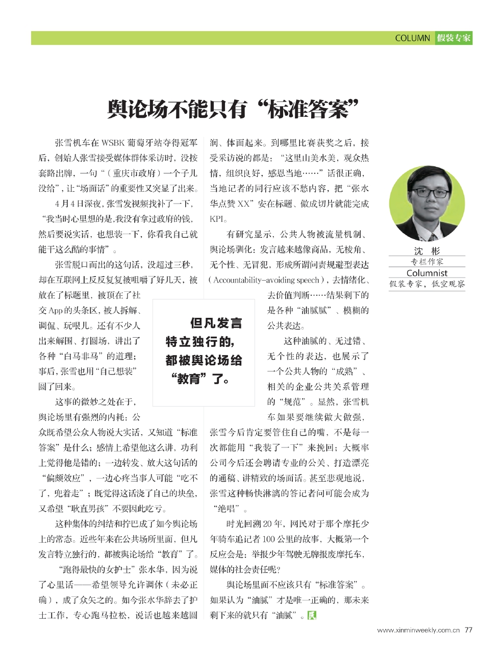 这种集体的纠结和拧巴成了如今舆论场上的常态。近些年来在公共场所里面,但凡发言特立独行的,都被舆论场给“教育”了。