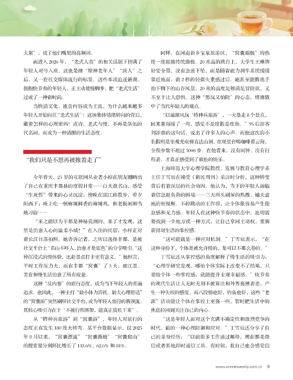 上海师范大学心理学院教授、发展与教育心理学系主任丁雪辰在接受《新民周刊》采访时分析,这种转变背后有着深层的社会动因。他认为,当下的年轻人面临着信息超负荷的困境——三天两头刷屏的热搜、铺天盖地的短视频、不停跳动的工作群,让个体很容易产生倦怠感和无力感。年轻人在这种快节奏的状态中,迫切需要找到一个地方或一种方式,让自己拿回主动权,重新获得对生活的掌控感。