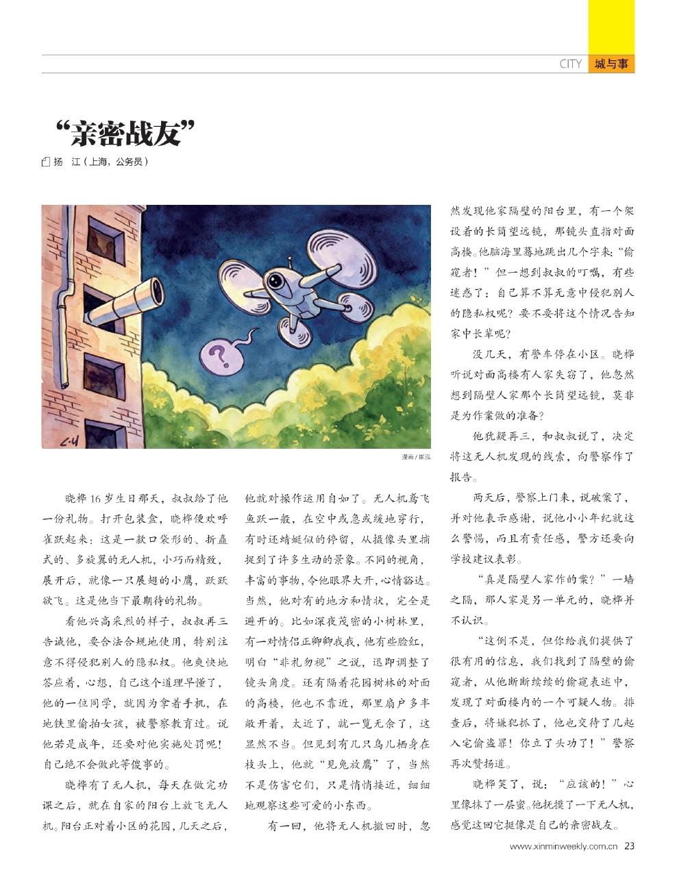 有一回,他将无人机撤回时,忽然发现他家隔壁的阳台里,有一个架设着的长筒望远镜,那镜头直指对面高楼。他脑海里蓦地跳出几个字来:“偷窥者!”但一想到叔叔的叮嘱,有些迷惑了:自己算不算无意中侵犯别人的隐私权呢?要不要将这个情况告知家中长辈呢?