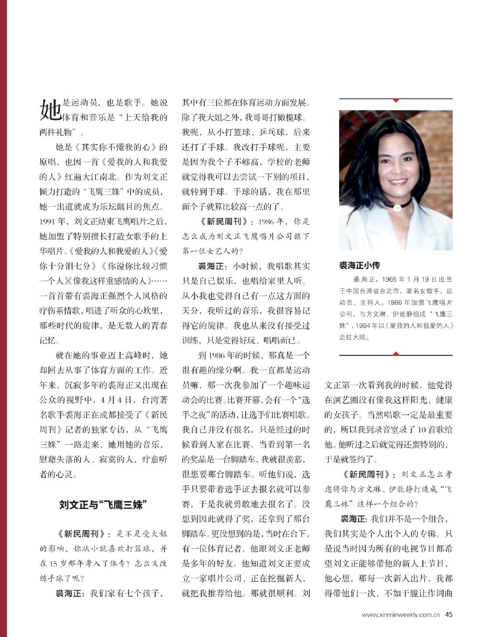 就在她的事业迈上高峰时,她却回去从事了体育方面的工作。近年来,沉寂多年的裘海正又出现在公众的视野中,4月4日,台湾著名歌手裘海正在成都接受了《新民周刊》记者的独家专访,从“飞鹰三姝”一路走来,她用她的音乐,慰藉失落的人、寂寞的人,疗愈听者的心灵。