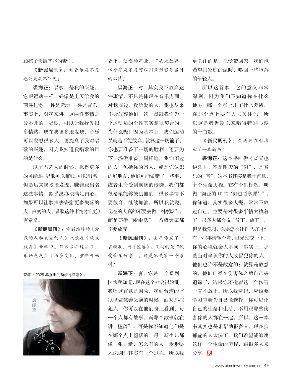 就在她的事业迈上高峰时,她却回去从事了体育方面的工作。近年来,沉寂多年的裘海正又出现在公众的视野中,4月4日,台湾著名歌手裘海正在成都接受了《新民周刊》记者的独家专访,从“飞鹰三姝”一路走来,她用她的音乐,慰藉失落的人、寂寞的人,疗愈听者的心灵。