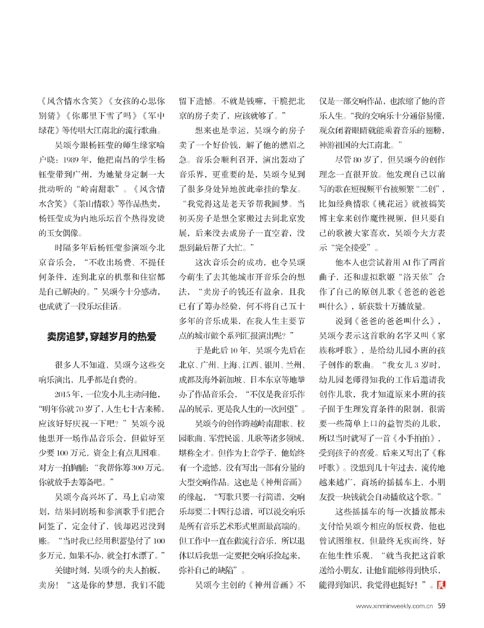 这次音乐会的成功,也令吴颂今萌生了去其他城市开音乐会的想法,“卖房子的钱还有盈余,且我已有了筹办经验,何不将自己五十多年的音乐成果,在我人生主要节点的城市做个系列汇报演出呢?”