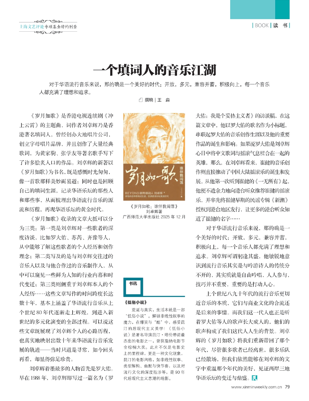 《岁月如歌》是香港电视连续剧《冲上云霄》的主题曲,词作者刘卓辉乃是香港著名填词人,曾经创办大地唱片公司,创立字母唱片品牌,并且创作了大量经典歌词,为黄家驹、张学友等著名歌手写下了许多脍炙人口的作品。刘卓辉的新著以《岁月如歌》为书名,既是感慨时光匆匆,像一首歌那样美妙而易逝;同时也是回顾自己的填词生涯,记录华语乐坛的那些人和那些事,从而梳理出华语流行音乐的源流和历程,再现华语乐坛的黄金时代。