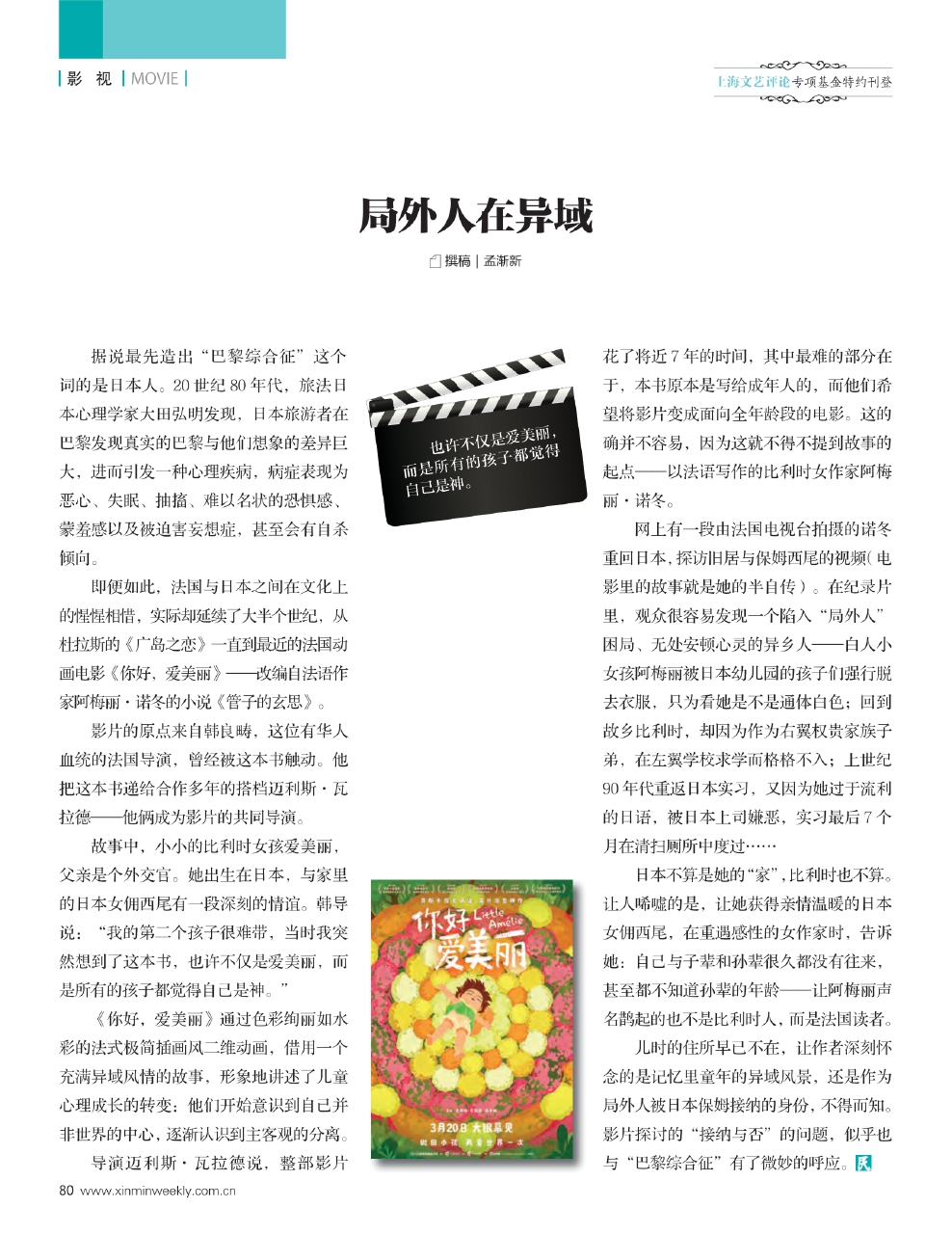 即便如此,法国与日本之间在文化上的惺惺相惜,实际却延续了大半个世纪,从杜拉斯的《广岛之恋》一直到最近的法国动画电影《你好,爱美丽》——改编自法语作家阿梅丽·诺冬的小说《管子的玄思》。