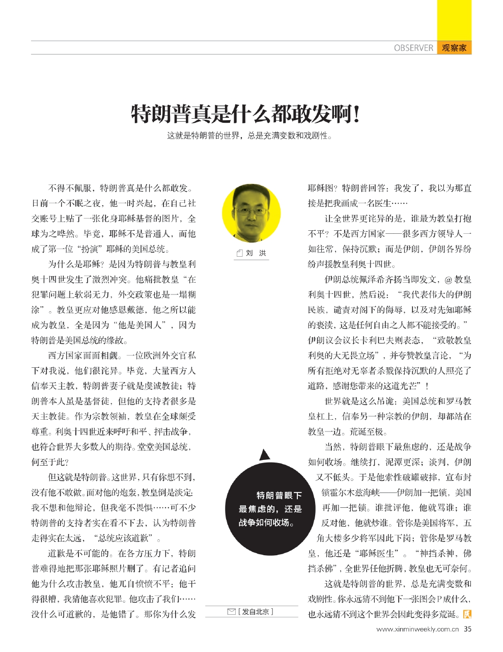 道歉是不可能的。在各方压力下,特朗普难得地把那张耶稣照片删了。有记者追问他为什么攻击教皇,他兀自愤愤不平:他干得很糟,我猜他喜欢犯罪。他攻击了我们……没什么可道歉的,是他错了。那你为什么发耶稣图?特朗普回答:我发了,我以为那直接是把我画成一名医生……