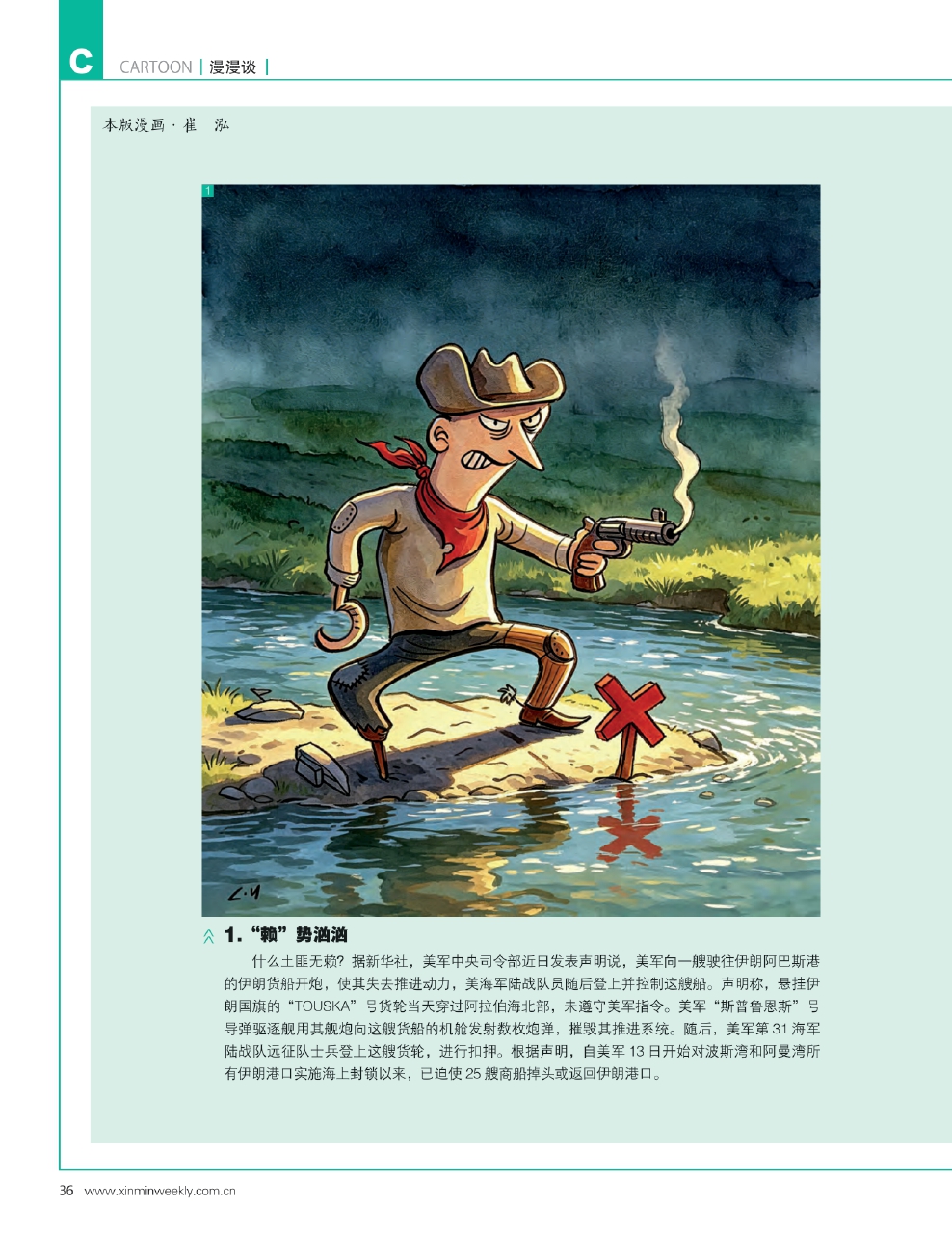 1.“赖”势汹汹 什么土匪无赖?据新华社,美军中央司令部近日发表声明说,美军向一艘驶往伊朗阿巴斯港的伊朗货船开炮,使其失去推进动力,美海军陆战队员随后登上并控制这艘船。声明称,悬挂伊朗国旗的“TOUSKA”号货轮当天穿过阿拉伯海北部,未遵守美军指令。美军“斯普鲁恩斯”号导弹驱逐舰用其舰炮向这艘货船的机舱发射数枚炮弹,摧毁其推进系统。随后,美军第31海军陆战队远征队士兵登上这艘货轮,进行扣押。根据声明,自美军13日开始对波斯湾和阿曼湾所有伊朗港口实施海上封锁以来,已迫使25艘商船掉头或返回伊朗港口。