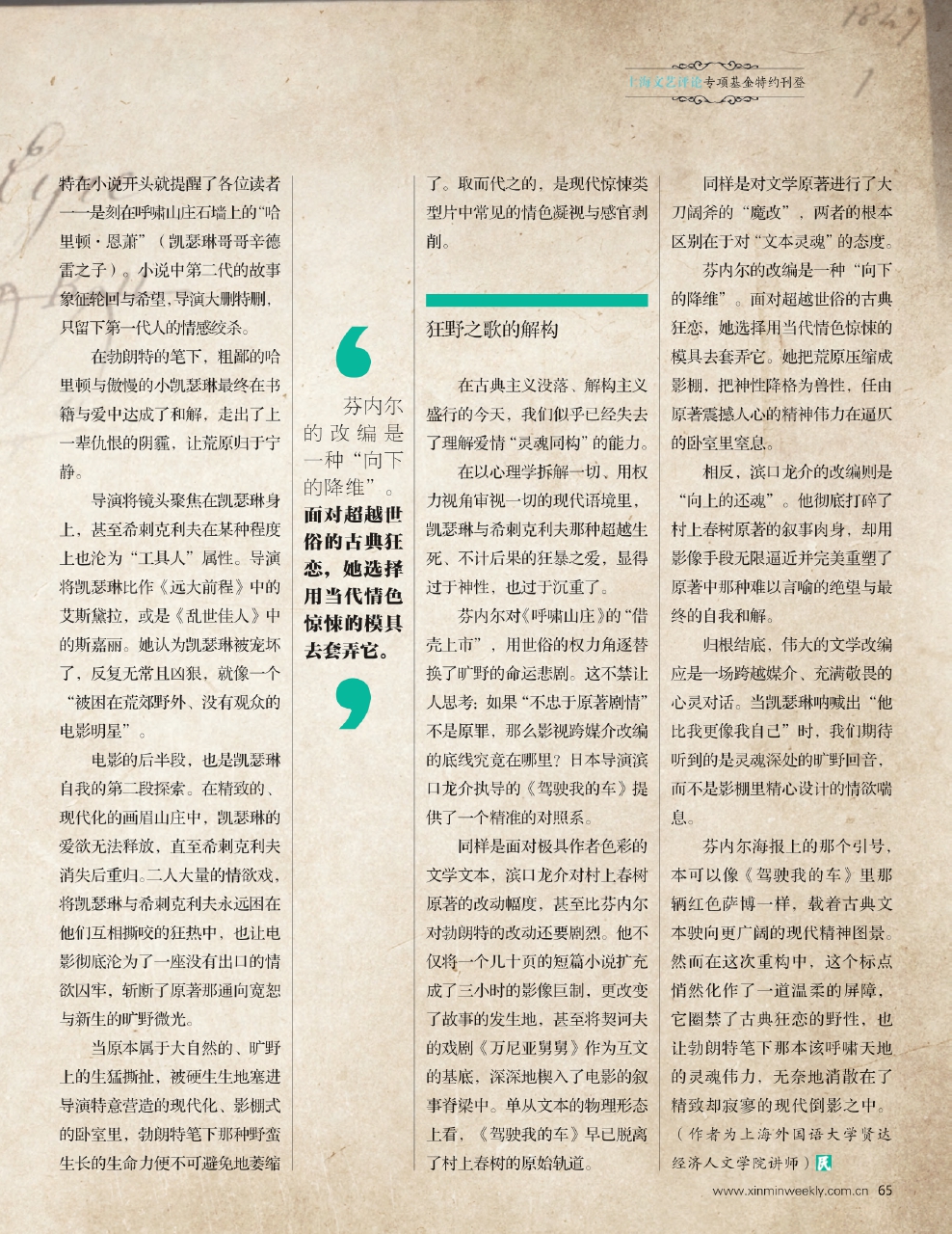 芬内尔海报上的那个引号,本可以像《驾驶我的车》里那辆红色萨博一样,载着古典文本驶向更广阔的现代精神图景。然而在这次重构中,这个标点悄然化作了一道温柔的屏障,它圈禁了古典狂恋的野性,也让勃朗特笔下那本该呼啸天地的灵魂伟力,无奈地消散在了精致却寂寥的现代倒影之中。(作者为上海外国语大学贤达经济人文学院讲师)