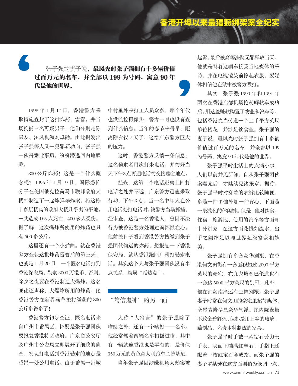 据称张子强每次作案之前,一定先要问问鬼神,然后才去“干大事”,每次作案后,并不是把钱财搜掠一空,而是总要留点钱财敬鬼神。