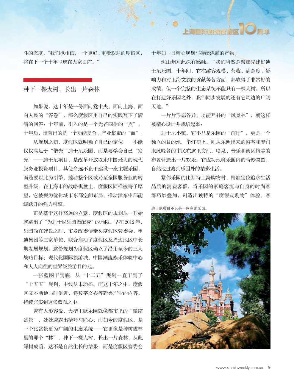 当记者请沈山州为《新民周刊》的读者,乃至度假区的全球游客和文旅投资者,送上一句“十周年寄语”时,他笑着同时说出感谢与邀请:“都说‘十年磨一剑’,度假区这十年的成功,凝聚着大家的共同努力,有你的功劳,也有我的付出——未来也是如此。十年砥砺奋进,十年风华正茂。今天的上海国际旅游度假区正以朝气蓬勃的姿态书写文旅新篇,希望大家一起来努力,一起来奋斗。下一个十年,因为有你,因为有我,度假区必将成为更加精彩璀璨的现代化国际旅游城——我们等你来!”